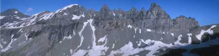 Tschingelhörner with Glarus thrust in the Glarus Alps seen from the Southeast near Sengnas Sut.