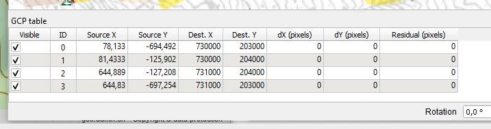 The old and new coordinates of selected points will appear in the GCP table. Shown are Source X and Source Y coordinates of the source file, as well as Dest. X and Dest. Y i.e. the new