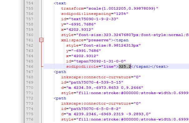 Outcrop number (325.2 in this example) is within a text-tag, coordinates of the cross are within the two path-tags,