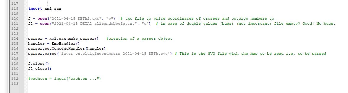 We first parse the SVG file, read the coordinates and the outcrop number and produce a text file.
